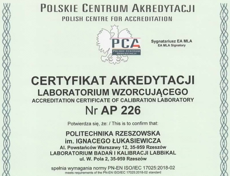 Z satysfakcją informujemy, że w dniu 13 marca 2025 r. Polskie Centrum Akredytacji potwierdziło kompetencje działalności laboratoryjnej Laboratorium Badań i Kalibracji LABBiKAL i przyznało akredytację nr AP 226 w odniesieniu do wymagań normy PN-EN ISO/IEC 17025:2018-02.