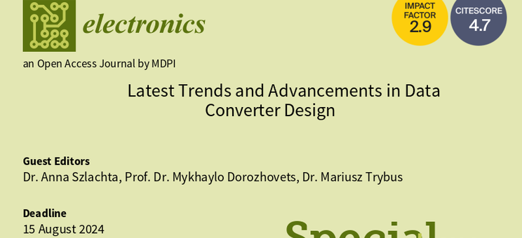 Dr inż. Anna Szlachta, prof. PRz, prof. dr hab. inż. Mykhaylo Dorozhovets oraz dr inż. Mariusz Trybus, prof. PRz zostali redaktorami gościnnymi specjalnego wydania Electronics pt. 'Latest Trends and Advancements in Data Converter Design'. Termin składania rękopisów upływa 15 sierpnia 2024 r. Celem tego specjalnego wydania jest opracowanie praktycznych i teoretycznych artykułów naukowych dotyczących trendów i rozwoju w projektowaniu przetworników danych. Głównym celem jest zaprezentowanie różnorodnych zastosowań oferowanych przez przetworników danych.