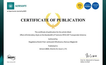 Mgr inż. Magdalena Nizioł współautorką artykułu "Effect of Embroidery Style on the Bandwidth of Textronic RFID UHF Transponder Antenna"