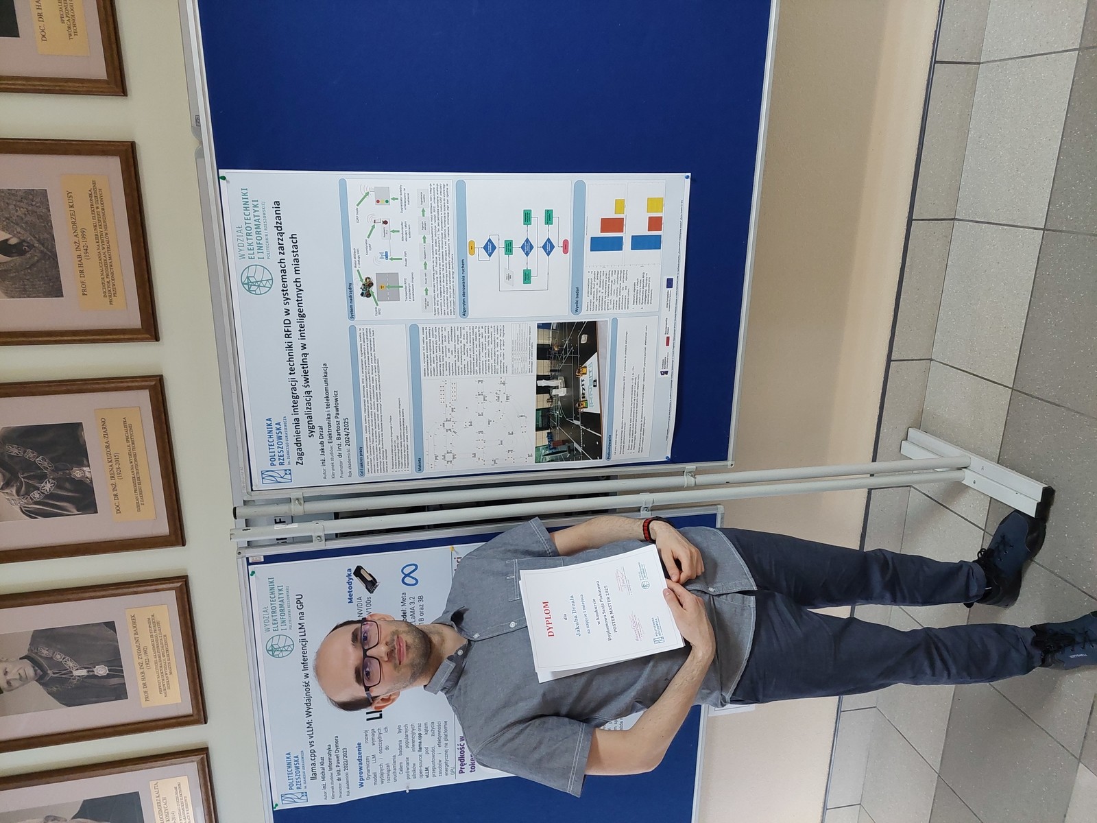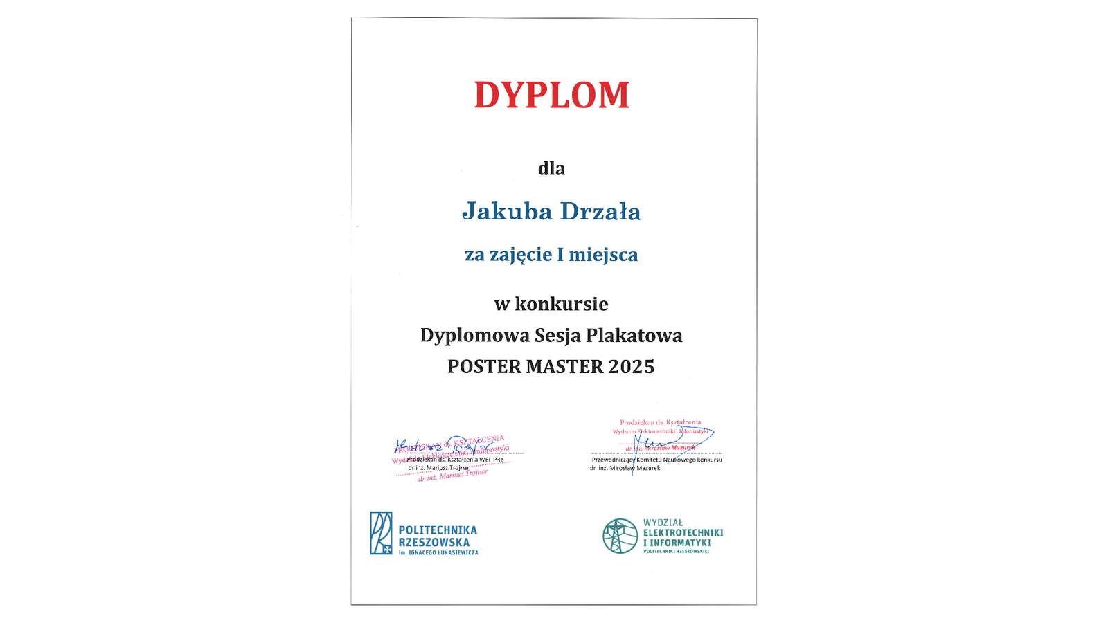 Konkurs POSTER MASTER ma na celu prezentację wyników badań uzyskanych przez studentów podczas realizacji prac dyplomowych magisterskich w danym roku akademickim. W edycji 2024/2025 udział w konkursie wziął pracownik KMiSD inż. Jakub Drzał i ze swoją pracą pt. "Zagadnienie integracji techniki RFID w systemach zarządzania sygnalizacją świetlną w inteligentnych miastach" zajął I miejsce.