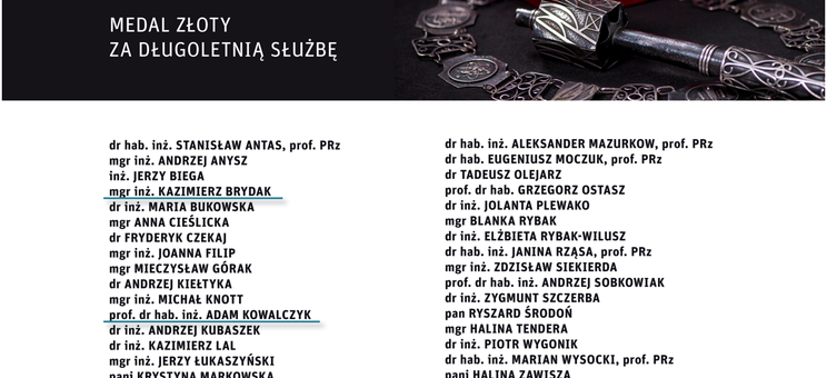 Wśród odznaczonych znaleźli się pracownicy KMiSD – mgr inż. Kazimierz Brydak oraz prof. dr hab. inż. Adam Kowalczyk. Obaj Panowie zostali uhonorowani złotymi medalami.